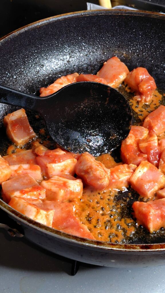 ④あたためたフライパンに、マリネした豚肉を入れ、炒めます。ある程度、火が入ったら、揚げておいたジャガイモ、アサリを加え、炒めます。パプリカパウダー、味を見て塩コショウで味を整えます。