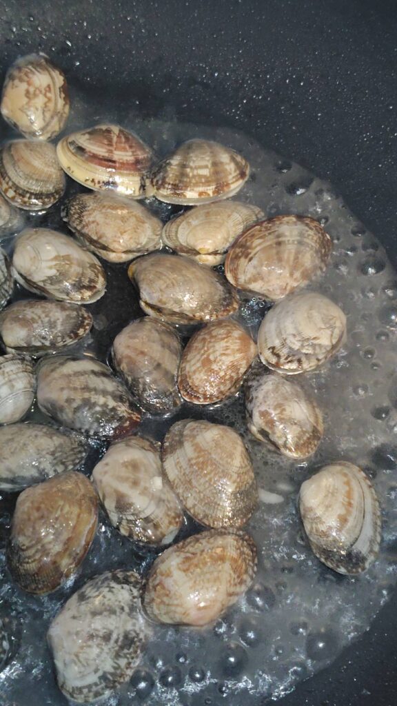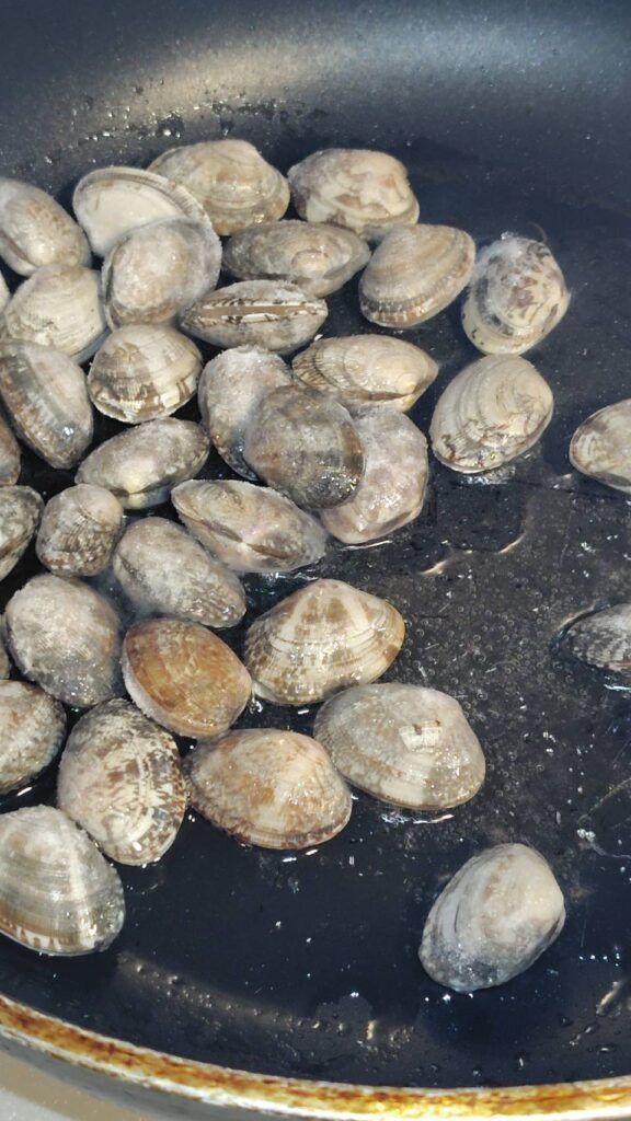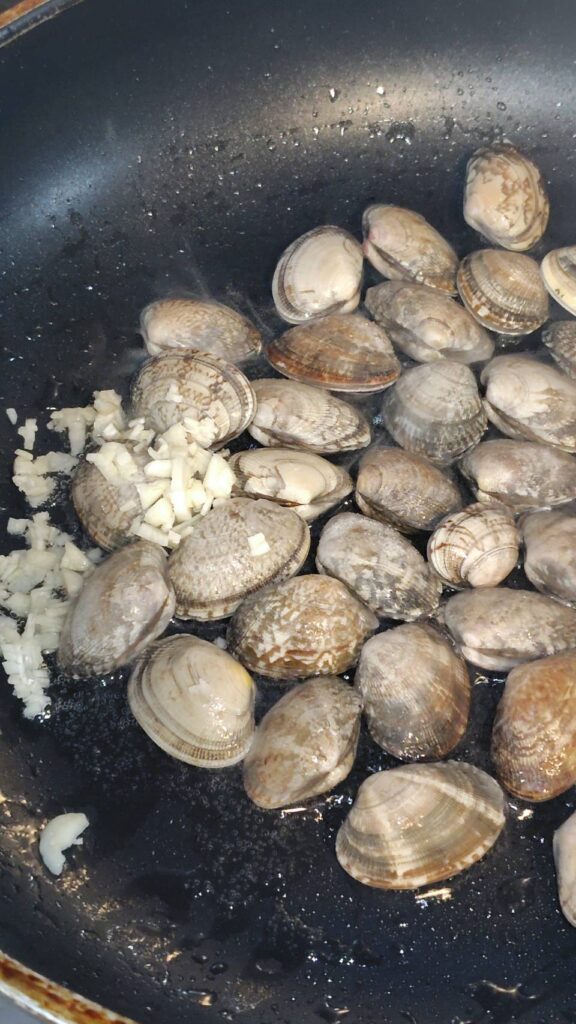 ③あたためたフライパンにオリーブオイルを注ぎ、アサリを入れます。軽く油を絡ませたら、ニンニクを入れ、白ワインを注ぎフタをして蒸し焼きにします。殻が開いたらお皿に取りおいておきます。