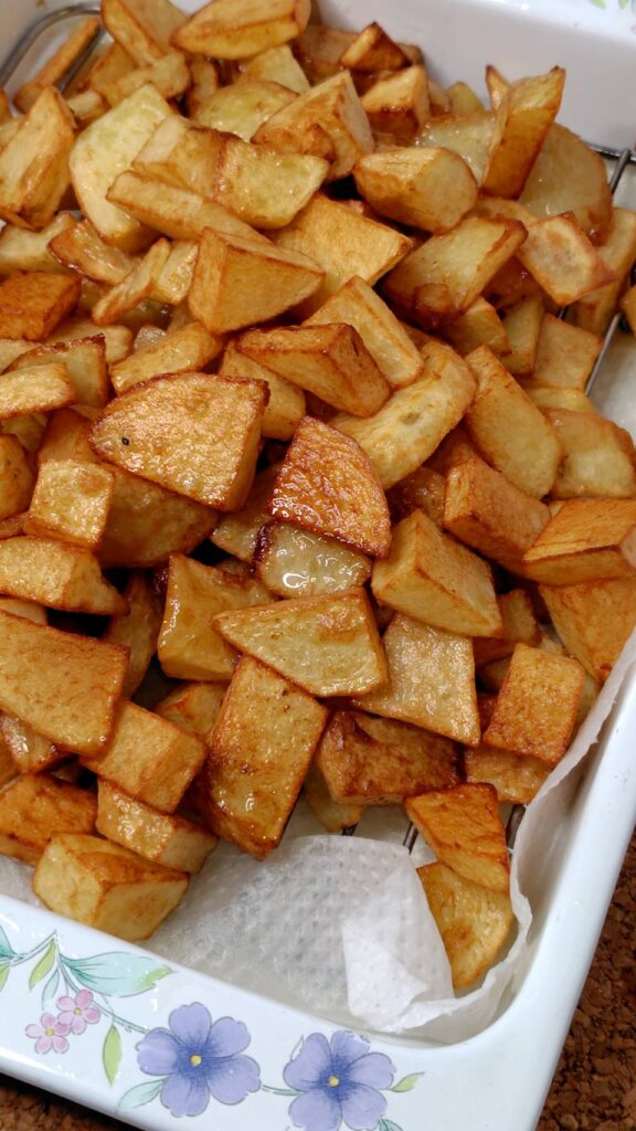 ②ジャガイモを1センチくらいの角切りにして、油で素揚げしておきます。