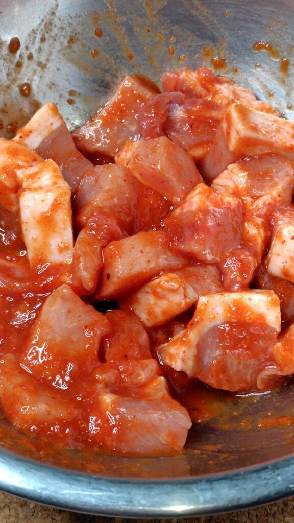 ①豚肉を再現した赤パプリカの調味料で軽くマリネする。30分から1時間程度で十分です。