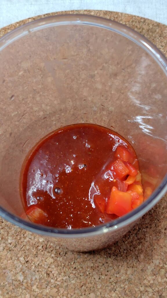 皮をむいた赤パプリカとキムチのもとを1:1でミキサーやハンドブレンダーで合わせるだけ。