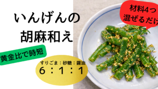 材料4つで作れる時短副菜、いんげんの胡麻和え。すりごま大さじ2・砂糖小さじ1・醤油小さじ1の黄金比で、混ぜるだけで失敗なし。忙しい日のあと一品におすすめです。