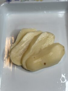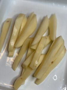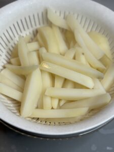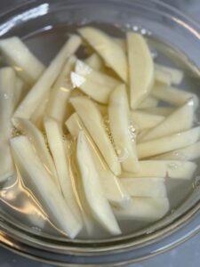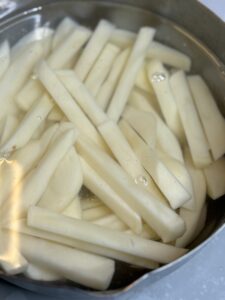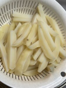 ①ジャガイモは皮をむき、棒状(バトネ)に切る。水にさらして余分なでんぷんをとる