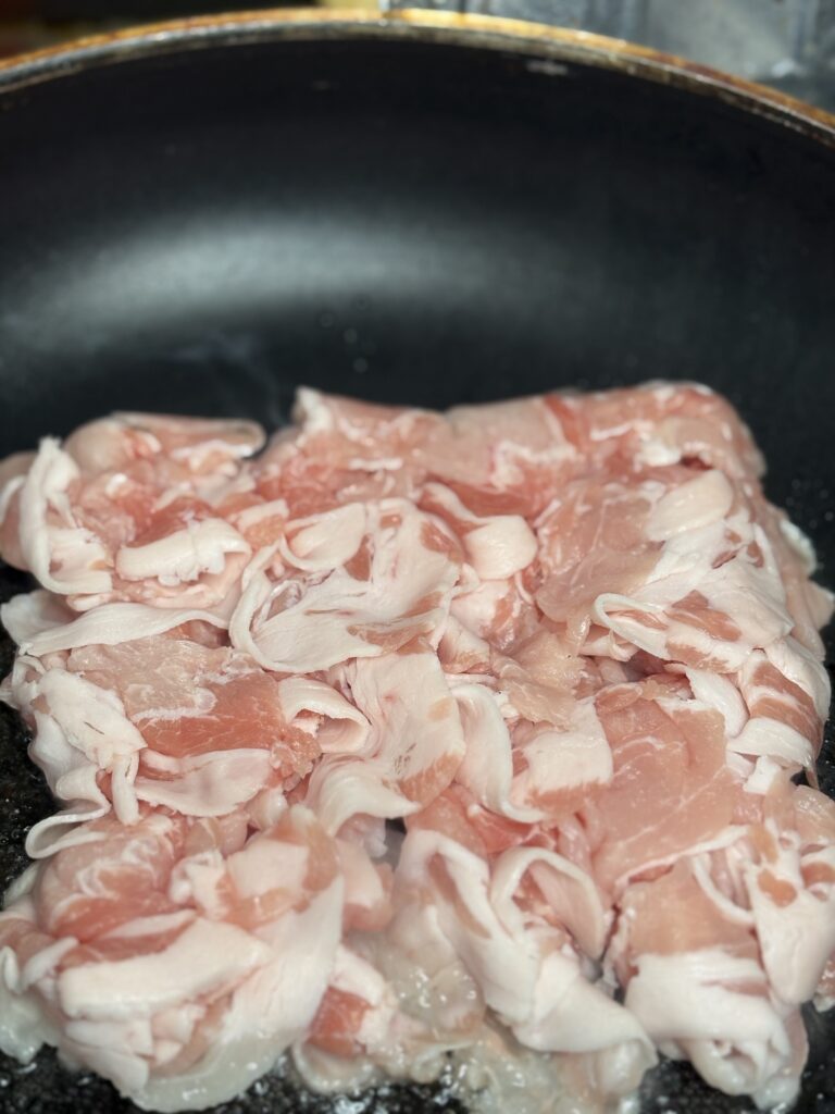 ②フライパンを中火にかけ、サラダ油を入れ、豚肉を焼く