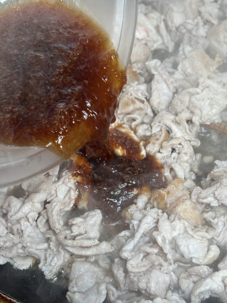 ③肉の色が変わったら①のタレを入れる