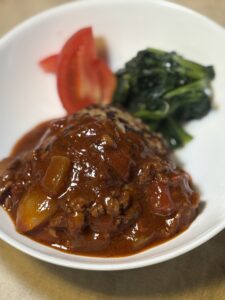シンプルなハンバーグもとってもおいしいですが、アレンジとしてハヤシライスのソースをかけてもおいしいので、シェアさせてください。